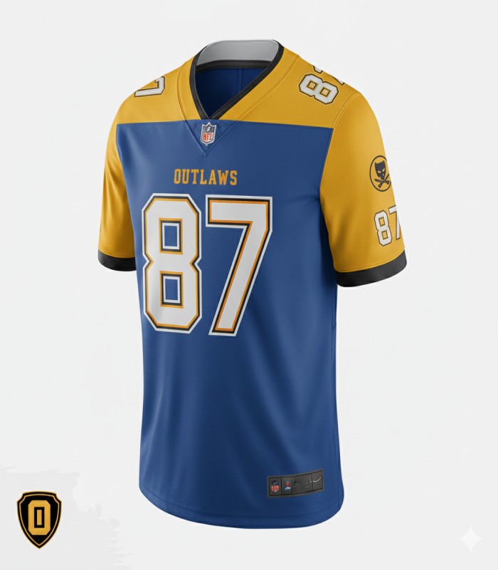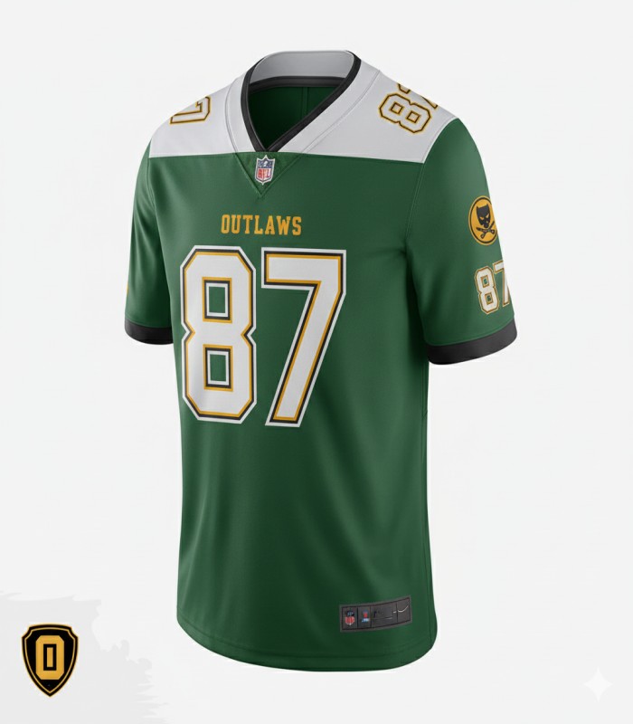 Custom Football Jersey: ‘OUTLAWS’ #87 | Emerald Green & Gold Pro Style Replica